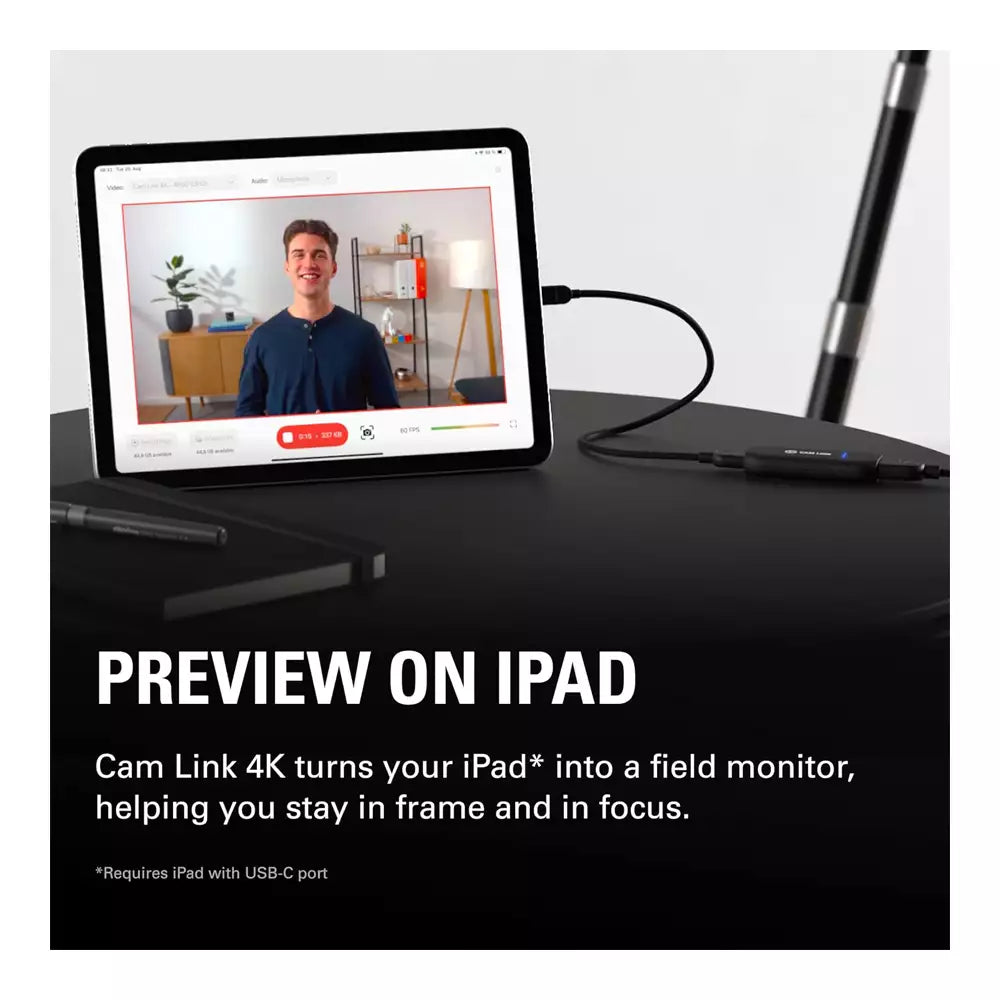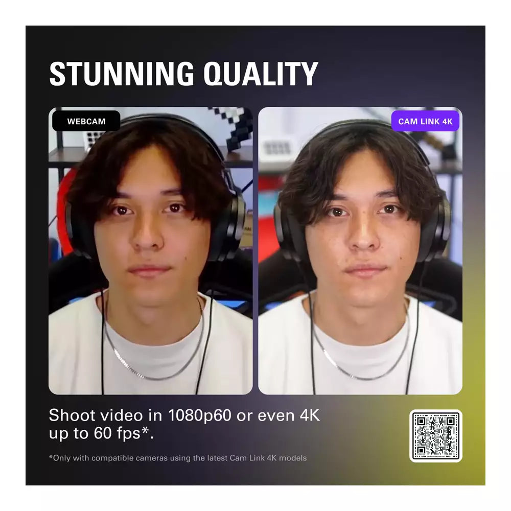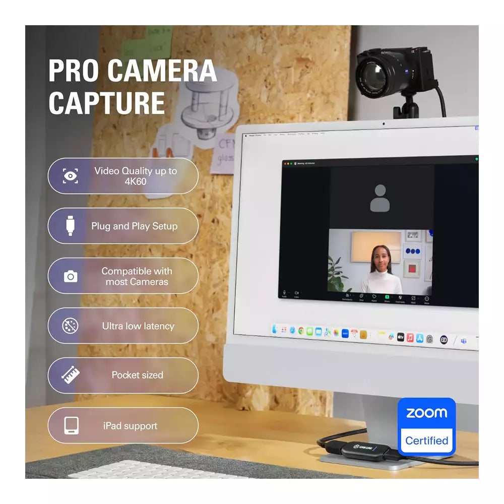 Cam Link 4K turns your DSLR or mirrorless camera into the ultimate webcam. Meet, stream, and record from your computer with stunning video quality. It works right out of the box in all your favorite apps, from OBS Studio to Zoom and Discord. USE YOUR CAMERA AS A WEBCAM Connect your high-end camera directly to a PC or Mac. Cam Link 4K disguises your camera as a USB webcam, so you can use it for streaming, video calls, and more. SEE THE DIFFERENCE With Cam Link 4K, you get the perks of a pro camera—sharper details, improved lighting, true-to-life color. All shot in stunning Full HD or even 4K up to 60 fps*. IN ALL YOUR APPS Cam Link 4K works anywhere you can use a webcam. Bring your camera along for everything—Teams meetings, Twitch streams, or even FaceTime chats. PLUG AND PLAY Getting started with Cam Link 4K is fast and easy. Just connect one end to your camera's HDMI port* and the other to your computer via USB 3.0. SUPER COMPATIBLE From camcorders to your GoPro, Cam Link 4K supports most modern cameras—all it takes is a clean HDMI output and unlimited runtime.