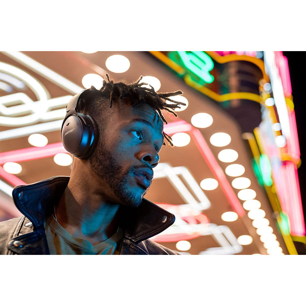 QuietComfort 45 headphones The first noise-canceling headphones are back, now with the new Aware Mode, lightweight materials for comfort, and proprietary acoustic technology for deep, clear audio. They’re not just an icon reborn – they’re the perfect balance of quiet, comfort, and sound. Noise cancelling Acoustic Noise Cancelling began with the original QuietComfort headphones from Bose. Tiny mics hidden in the earcups measure, compare, and react to outside noise, then cancel it with the opposite signal. Choose Quiet Mode for full noise cancelling, or Aware Mode to let in your environment. Aware Mode brings the outside in. Microphones pick up the sounds around you and play them naturally through the headphones for increased awareness of your surroundings. It’s your music (or messages, or podcasts) and your environment at the same time. Clearer calls A quad microphone system uses tiny mics working together to focus on your voice with a noise-rejecting algorithm that filters out surrounding sounds. Ideal for when making or taking phone calls on the go. Sound TriPort acoustic architecture and Bose innovations like Volume optimized Active EQ add depth and clarity to your music while maintaining balance at any volume. The bass stays consistent when you turn it down and the music is still clear when you turn it up. Comfort Everything that made the original pair an icon is still here – just refined for a cleaner look. Plush synthetic leathers, impact resistant glass-filled nylon, and custom cast-metal hinges were selected for their comfort and durability. And with minimal clamping force, you may forget you’re wearing them. Battery Life These headphones offer more listening time than their predecessor, with up to 25 hours from a single charge. They charge via USB-C for up to 2.5 hours. In a hurry? Just a 15-minute charge offers up to 2.5 hours of playtime. Or plug in the included audio cable and listen for longer